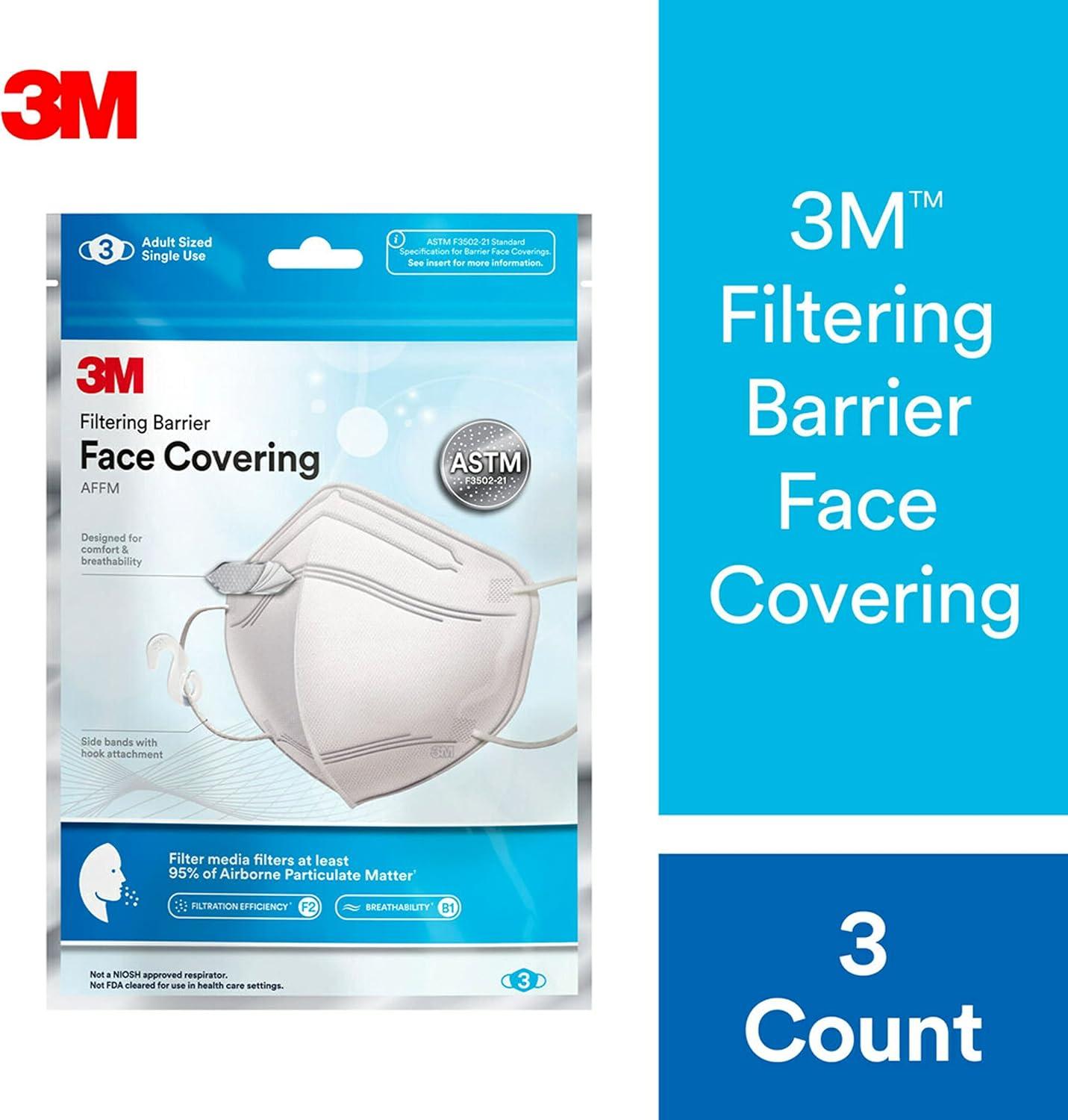 The 3M Filtering Barrier Face Covering is a barrier face covering that can also help reduce airborne particulate exposure, when used as instructed. It can be used in crowded places, airplanes or everyday moments to help filter airborne particles. Per ASTM F3502-21 Standard for Barrier Face Coverings; Not a NIOSH approved respirator.
