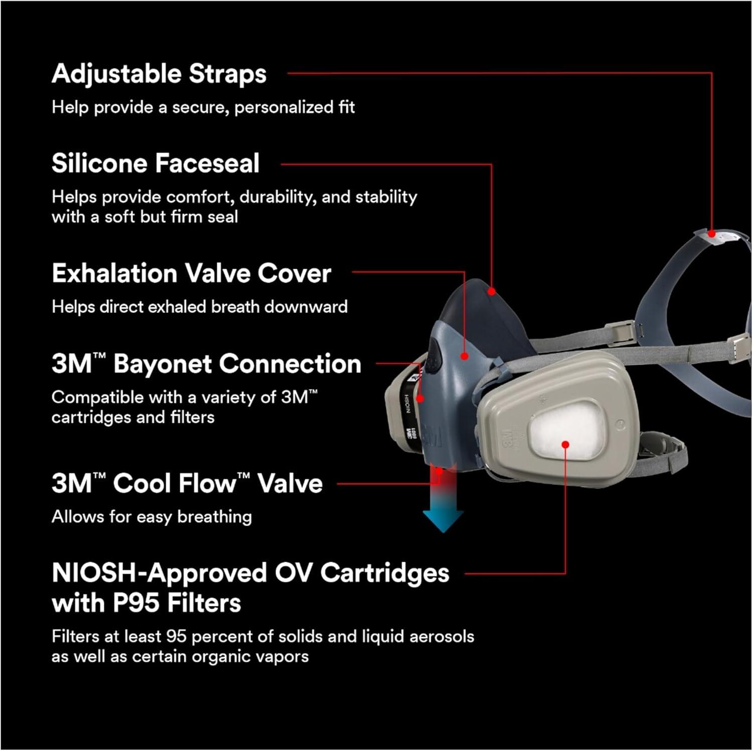 NIOSH-APPROVED 5P71 P95 RATED filters for at least 95% filtration efficiency against solids and liquid aerosols, as well as oil-based particulates